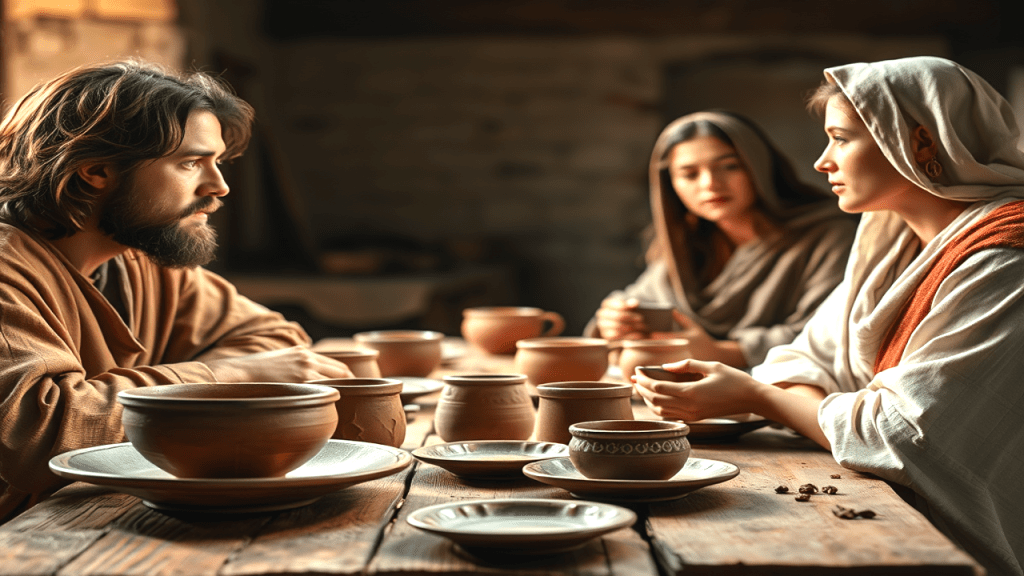 Jesus visited the house of Martha and Mary. Martha was distracted with preparations for the grand dinner, while Mary sat at the Lord’s feet to listen to his teachings.