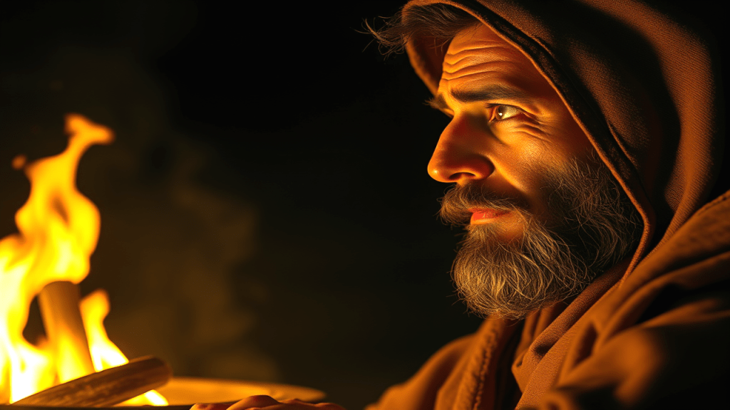 They took Jesus and brought Him to the high priest’s house for questioning. There, the chief religious leaders had gathered. Meanwhile, Peter followed Him from a distance, entered the courtyard, and sat with the guards to warm himself by the fire.