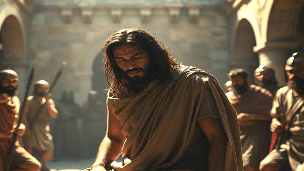 They mocked him, saying, “Hail, King of the Jews!” They struck him on the head with a staff, spat on him, and knelt before him in mockery. When they had finished their mockery, they led him away to be crucified.